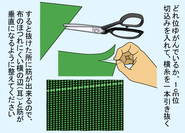 地の目をそろえる時は端の方の糸を抜いてできた筋を基準にするといいと思います